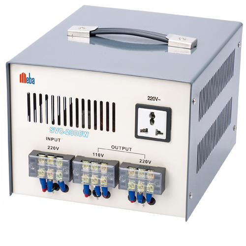 Meba SVC Voltage Stabilizer SVC-2000W For office equipment, test equipment, lighting systems, safety alarm systems, communication systems, medical equipment, duplicators, stereo sound equipment, industrial automatic equipment, color film developing equipment, digital control machine tools, checkout equipment, TV sets, office appliances.Meba SVC Voltage Stabilizer SVC-2000W