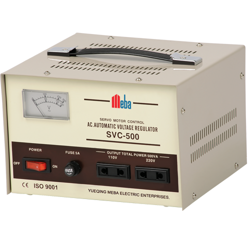 Meba Voltage Stabilizer SVC-500VA For office equipment, test equipment, lighting systems, safety alarm systems, communication systems, medical equipment, duplicators, stereo sound equipment, industrial automatic equipment, color film developing equipment, digital control machine tools, checkout equipment, TV sets, office appliances.Meba Voltage Stabilizer SVC-500VA